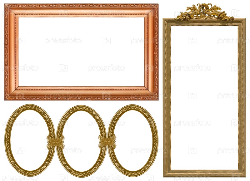 Набор золотых рамок для картин, зеркал или фотографий, изолированных на белом фоне