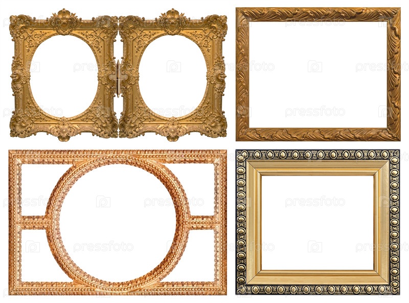 Набор золотых рамок для картин, зеркал или фотографий, изолированных на белом фоне