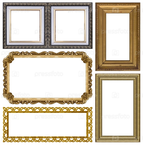 Набор золотых рамок для картин, зеркал или фотографий, изолированных на белом фоне