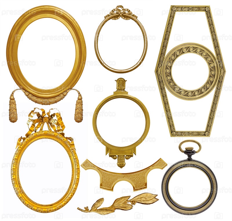Набор золотых рамок для картин, зеркал или фотографий, изолированных на белом фоне