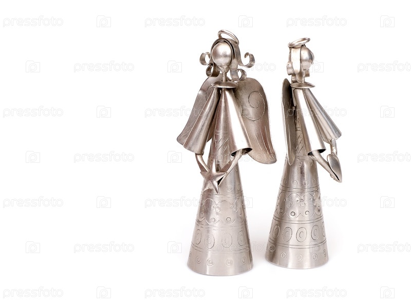 Два металлических ангела со звездой и сердцем изолированы на белом фоне