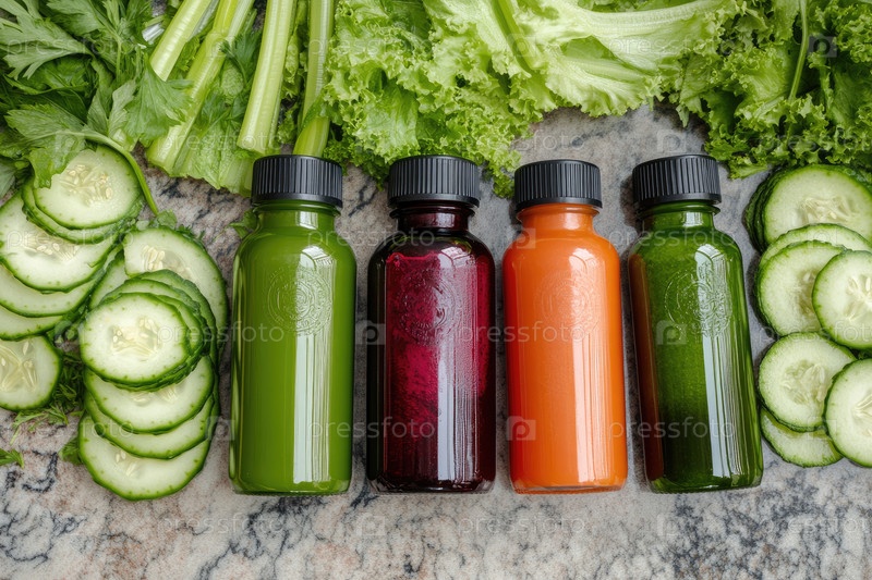 Трио сока холодного отжима с свеклой, морковью и сельдереем на мраморной поверхности