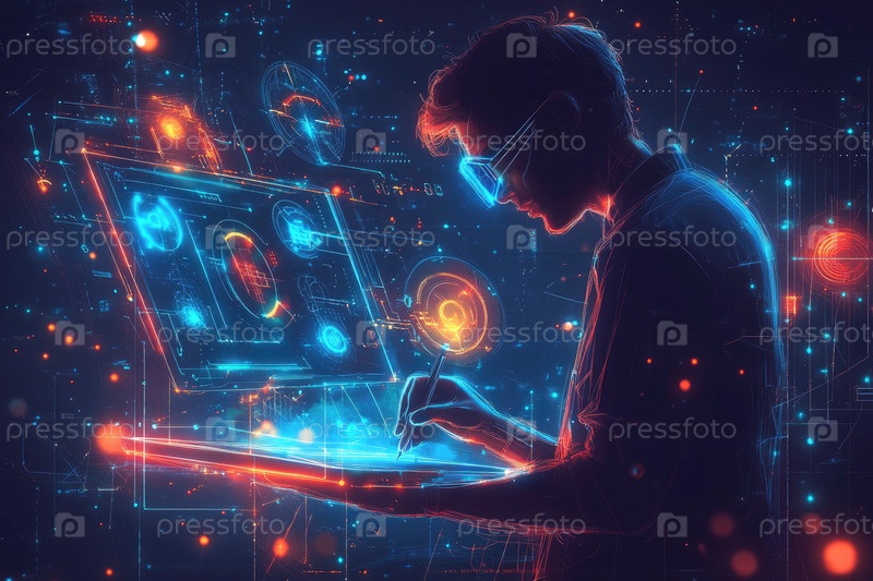 Дизайнер Metaverse создает виртуальные объекты на светящемся цифровом планшете со светлыми следами