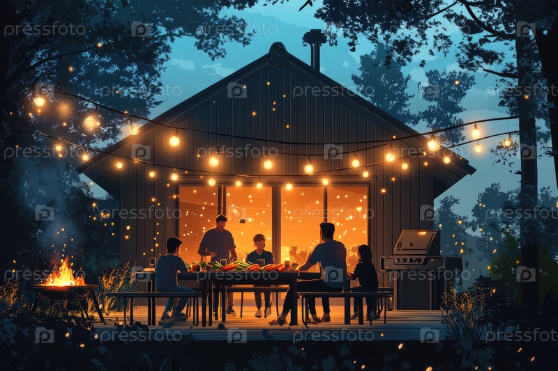 Вечернее барбекю, собирающееся на уютной деревянной даче с семьей и жареными овощами