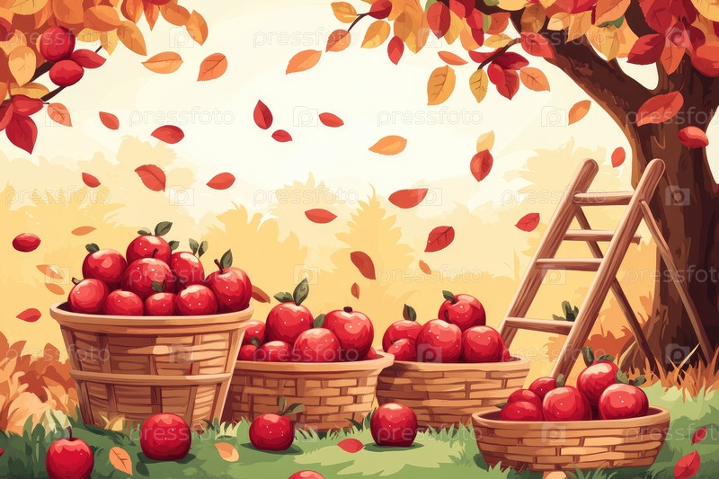Яркий осенний урожай яблок с корзинами, падающими листьями и лестницей против дерева