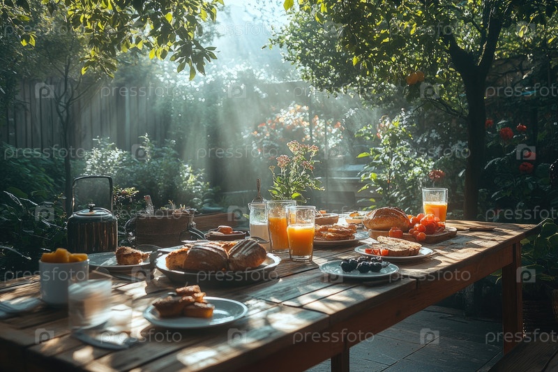 Молодая семья наслаждается спокойным завтраком в саду с домашней едой и солнечным светом