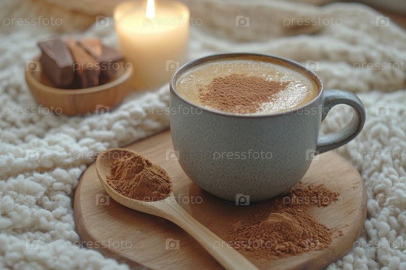 Уютный горячий какао с овсяным молоком в матовой керамической кружке рядом со свечами и какао-порошком