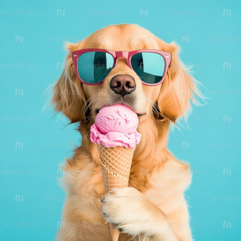 Золотой ретривер в стильных солнцезащитных очках радостно держит конус мороженого с розовым мороженым на ярком синем фоне, захватывая игривый летний момент