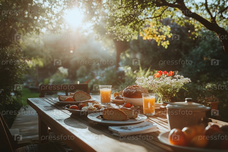 Утренний завтрак в саду с домашним хлебом и свежими фруктами