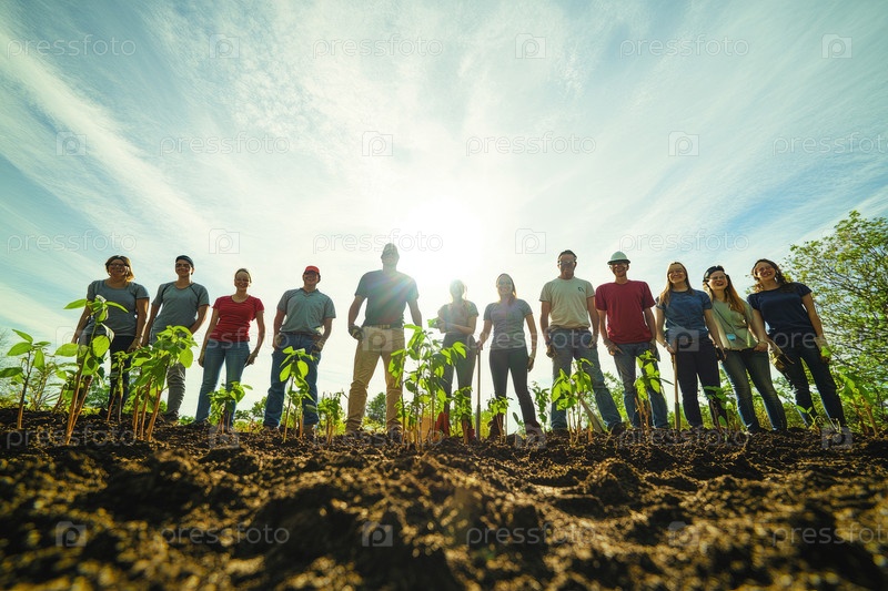 Группа разнообразных людей, стоящих в поле с молодыми растениями, демонстрируя командную работу и дух сообщества под ярким небом, подчеркивая экологическую устойчивость и рост