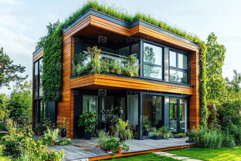 Современный экологически чистый дом с зеленой крышей и пышным садом, с большими окнами, деревянным внешним видом и яркими растениями, демонстрирующими устойчивую архитектуру и принципы дизайна