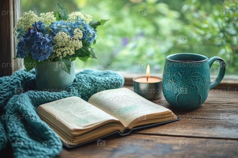 Открытый журнал и фуражный букет создают уютную, минималистскую обстановку на деревянном столе