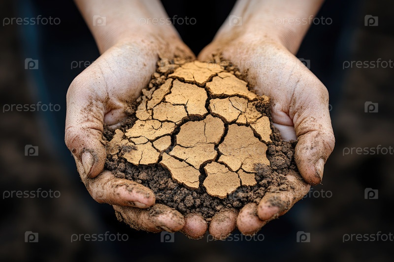 Руки, держащие треснувшую сухую землю, демонстрируя влияние засухи и изменения окружающей среды, подчеркивая важность усилий по сохранению почв и устойчивости для будущих поколений