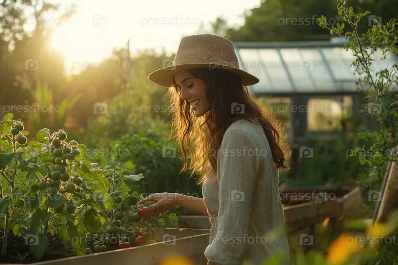 Женщина поливает помидоры в приподнятой садовой кровати в золотой час с деревенским тепличным фоном