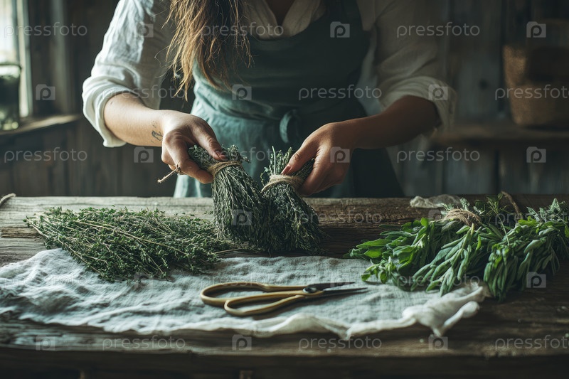 Женщина завязывает пучки сушеных трав на деревенском деревянном столе в теплый поздний летний солнечный свет