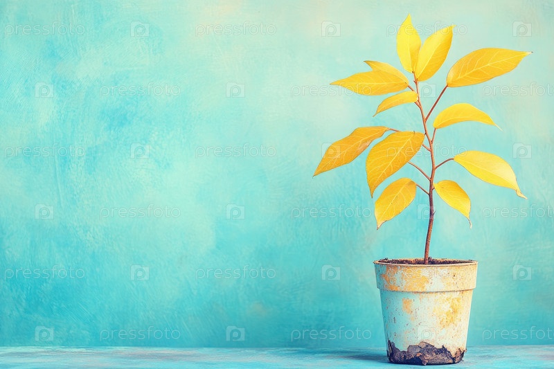 Поттерное растение с яркими желтыми листьями стоит на текстурном синем фоне, демонстрируя освежающий элемент декора в помещении и добавляя прикосновение природы к окружающей среде