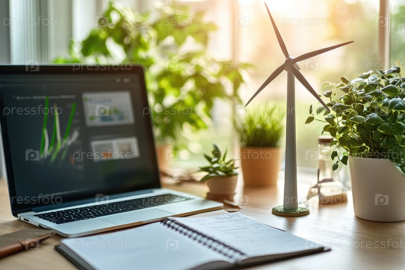 Ноутбук на деревянном столе с отображаемыми графиками, в окружении зеленых растений и небольшой ветровой турбины, создавая экологичную рабочую атмосферу для производительности и инноваций
