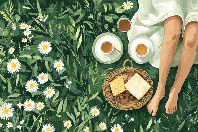 Летний пикник на полевом лугу с травяным чаем и местными деликатесами