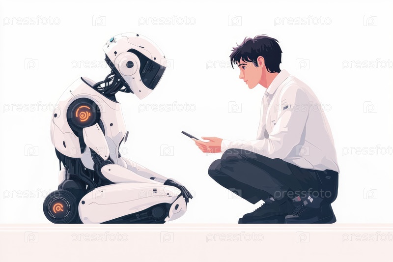 Вдумчивый разговор между тренером по этике ИИ и роботом-гуманоидом в минималистской обстановке