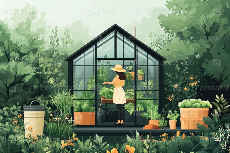 Современная крошечная теплица с женщиной, ухаживающей за овощами в спокойной обстановке сада