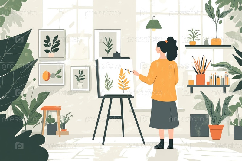 Зрелая женщина создает искусство в солнечной студии, наполненной растениями и художественными принадлежностями
