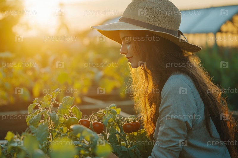 Женщина-садовник с длинными волосами, в соломенной шляпе, воспитывает томатные растения в ярком саду, освещенном теплым солнечным светом, отражающим связь с природой