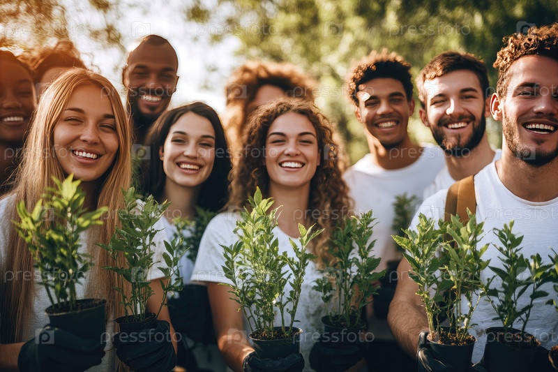 Разнообразная группа людей радостно держит горшечные растения на открытом воздухе, в окружении зелени, подчеркивая дух сообщества и приверженность экологической устойчивости
