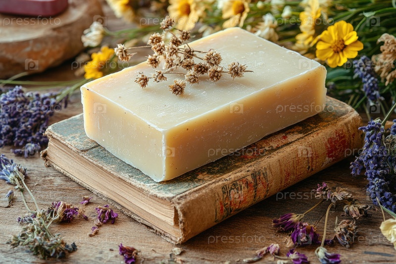 Мыльный бар ручной работы покоится на винтажной книге, окруженный сушеными цветами и травами, вызывая безмятежную и успокаивающую атмосферу, идеально подходящую для хорошего самочувствия и ухода за собой