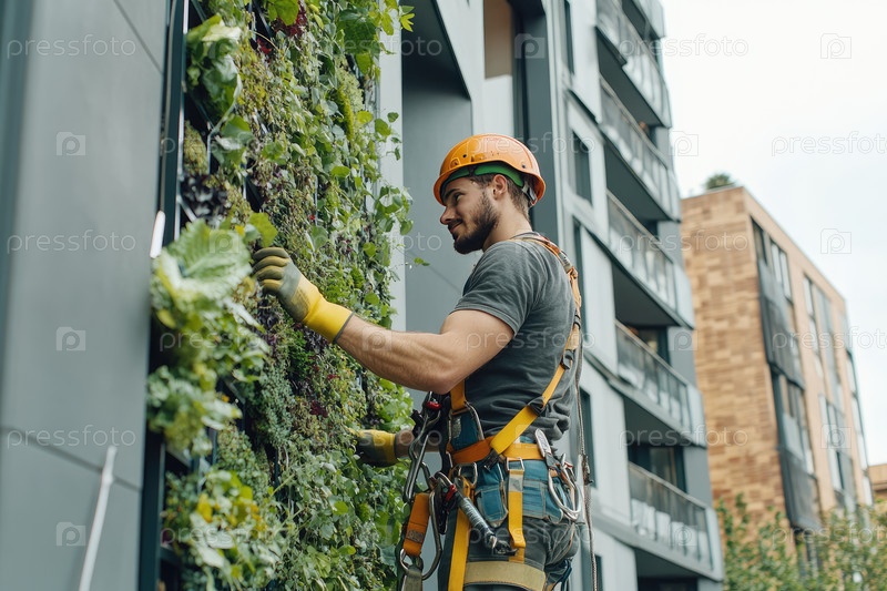 Садовник в оборудовании безопасности стремится к вертикальному саду на современном здании, выделяя пышные растения и инновационные методы городского садоводства