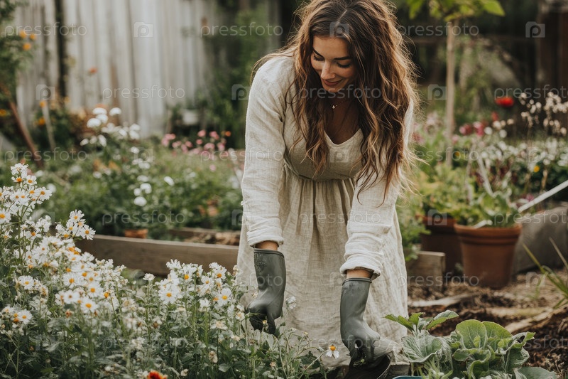 Женщина-садовница в светлом платье воспитывает клумбы в ярком саду, окруженном пышной зеленью и красочными цветами, олицетворяющими красоту природы