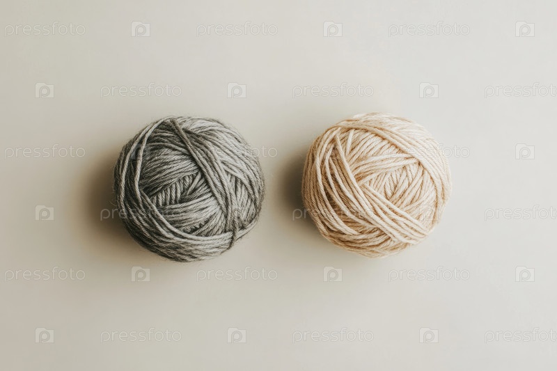 Два текстурированных шара из пряжи, один в сером, а другой в бежевом, отображаются на мягком светлом фоне, идеально подходит для различных крафтовых и трикотажных работ