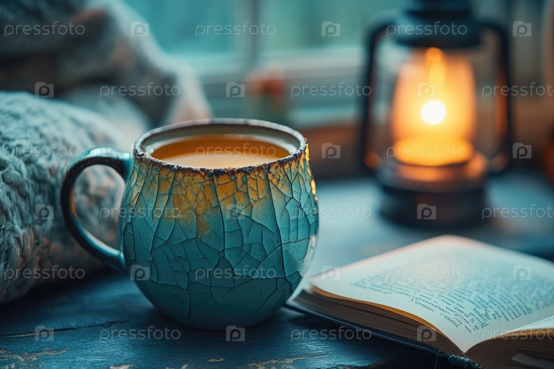 Треснутая керамическая кружка, наполненная теплым напитком, сидит на деревенском деревянном столе рядом с открытой книгой и светящимся фонарем, создавая уютную атмосферу