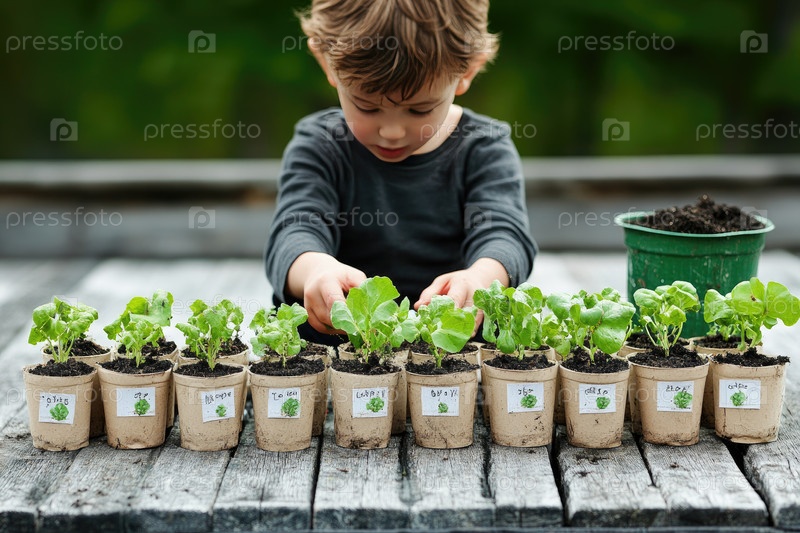 Ребенок сосредоточился на посадке саженцев в биоразлагаемых горшках на деревенском деревянном столе, окруженном пышной зеленью, подчеркивая связь с природой и навыки садоводства