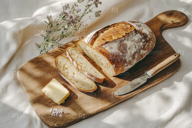 Кустарный хлеб, выставленный на деревянной доске, с ломтиками и маслом, в сопровождении ножа и цветов, вызывая теплую и приглашающую кухонную сцену