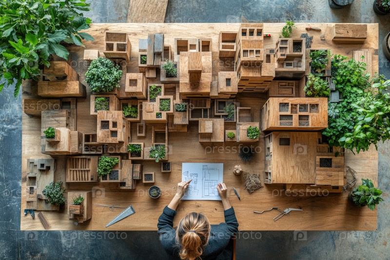 Дизайн рабочего пространства с деревянными архитектурными моделями и растениями, как человек изучает чертежи на столе, иллюстрируя творческий процесс в архитектуре
