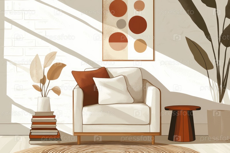 Стильная гостиная демонстрирует привлекательное кресло с подушками, круглый боковой стол и горшечное растение, все купающееся в теплом солнечном свете для уютной атмосферы