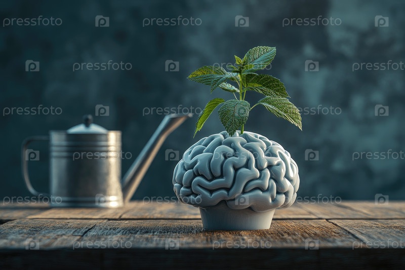 Концептуальная иллюстрация плантатора в форме мозга с зеленым растением, растущим из него, символизирующим творчество и рост, наряду с поливной банкой на деревенском деревянном столе