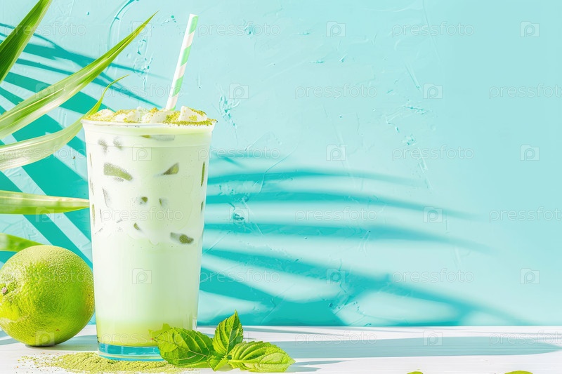 Освежающий зеленый напиток, наполненный льдом, сидит на белой поверхности, окруженный свежими листьями мяты и лаймом, на ярком бирюзовом фоне, создавая оживленную летнюю атмосферу