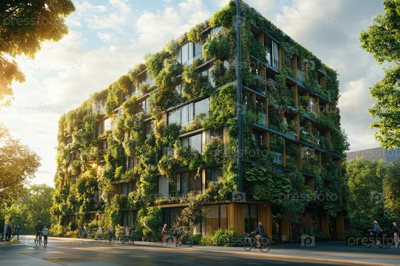Современное экологически чистое здание демонстрирует пышную зелень, покрывающую его фасад, смешивая природу с архитектурой в городской среде, продвигая устойчивость и инновационные концепции дизайна