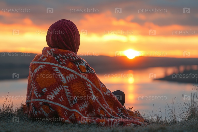 Индивидуальный завернутый в красочное одеяло, сидящий на травянистом холме, наблюдающий за закатом солнца над спокойной рекой, создающий безмятежную атмосферу с теплыми оттенками, отражающимися на поверхности воды