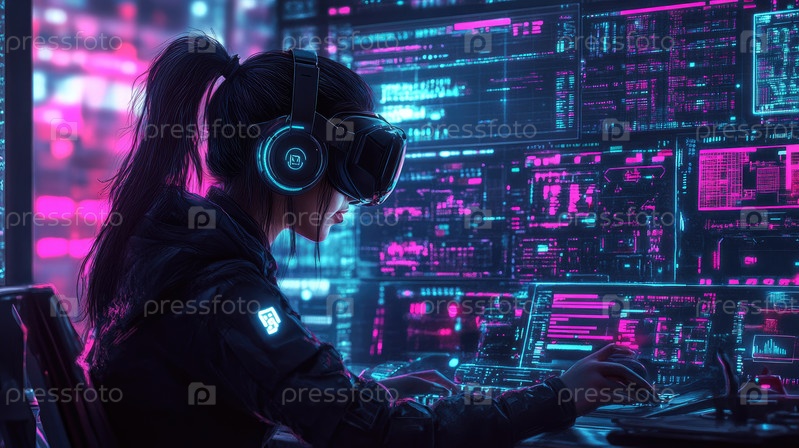 Женщина-геймер, носящая гарнитуру виртуальной реальности, полностью вовлечена в цифровую среду, наполненную яркими неоновыми огнями и сложными дисплеями данных, демонстрирующими захватывающий игровой опыт