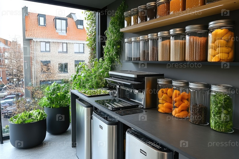 Современный кухонный интерьер со свежими травами в горшках, стеклянными банками, наполненными ингредиентами, и гладкими приборами, создавая яркую и привлекательную атмосферу для кулинарного творчества