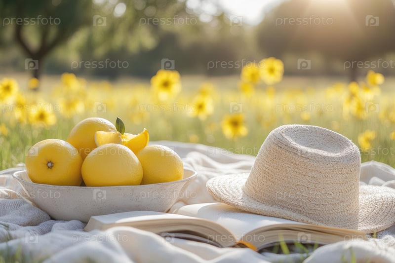 Свежие лимоны, расположенные в миске рядом с соломенной шляпой и открытой книгой на мягком одеяле, окруженные яркими цветами в освещенном солнцем поле, создают безмятежную и привлекательную атмосферу