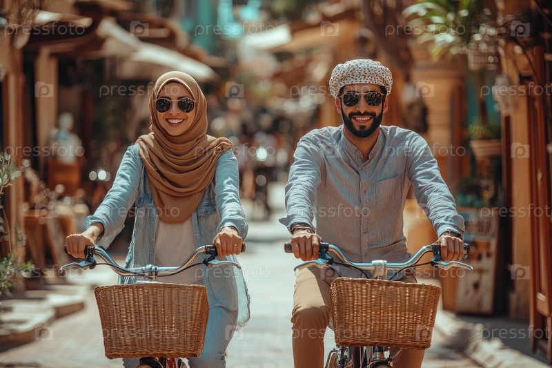 Пара наслаждается неспешной прогулкой на велосипедах по живописной улице, окруженной красочными магазинами и теплым солнечным светом, создавая радостную и приглашающую атмосферу для исследования