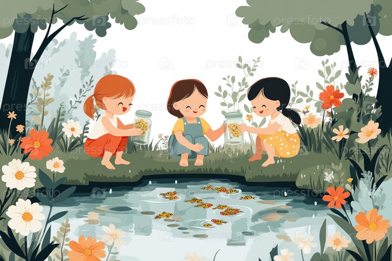 Трое детей счастливо играют у пруда в солнечный день, в окружении красочных цветов и пышной зелени, создавая радостную атмосферу дружбы и исследования природы