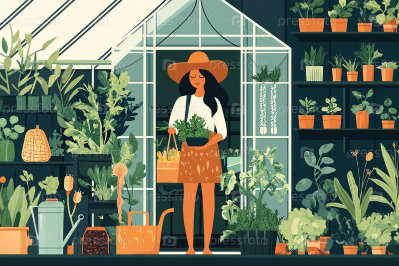 Женщина в теплице в солнечной шляпе держит корзину, наполненную растениями, окруженную пышной зеленью и различными горшками, создавая безмятежную и приглашающую атмосферу садоводства