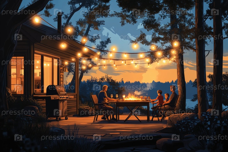 Семья наслаждается теплым вечером вокруг огненной ямы на патио, освещенной струнными огнями, с красивым закатом на заднем плане, создавая расслабленную и приглашающую атмосферу