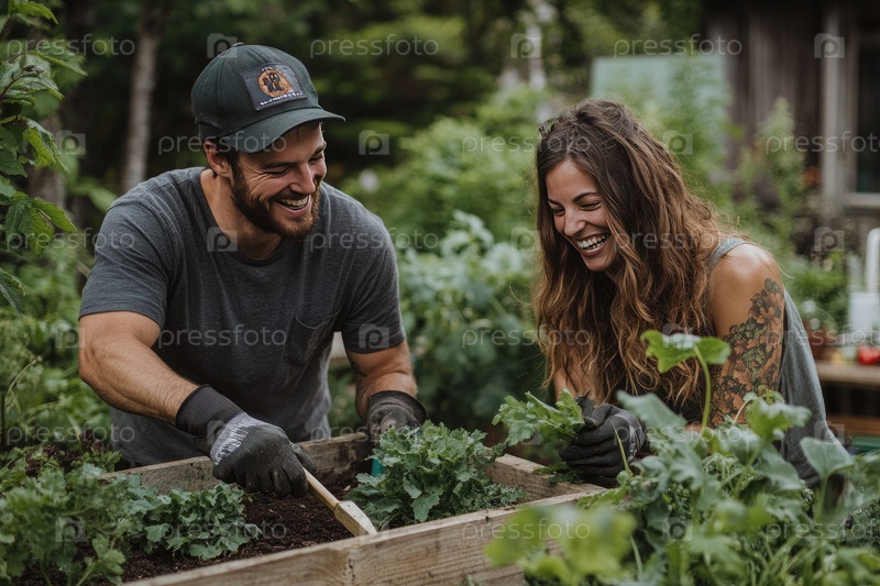 Улыбающаяся пара занимается садоводством, сажая свежие овощи в деревянную приподнятую кровать в окружении зелени, демонстрируя командную работу и радость в яркой обстановке на открытом воздухе