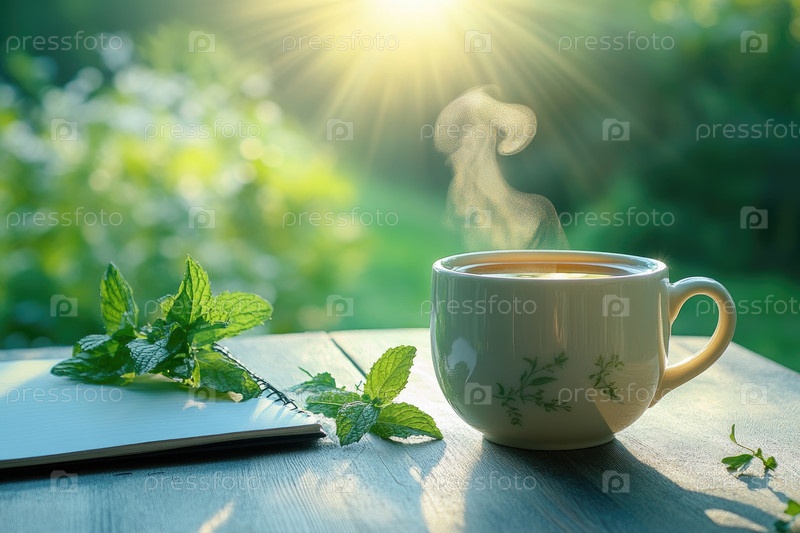 Паровая чашка травяного чая сидит на деревенском деревянном столе в сопровождении свежих листьев мяты и тетради, окруженной пышной зеленью и мягким солнечным светом, создавая мирную атмосферу