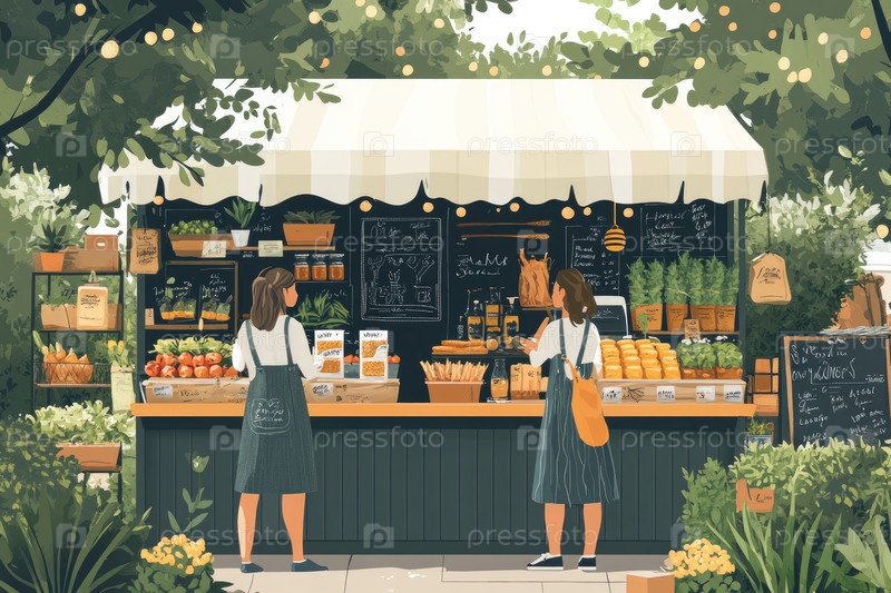 Две женщины делают покупки в оживленном торговом центре на открытом рынке, наполненном свежими продуктами и зеленью